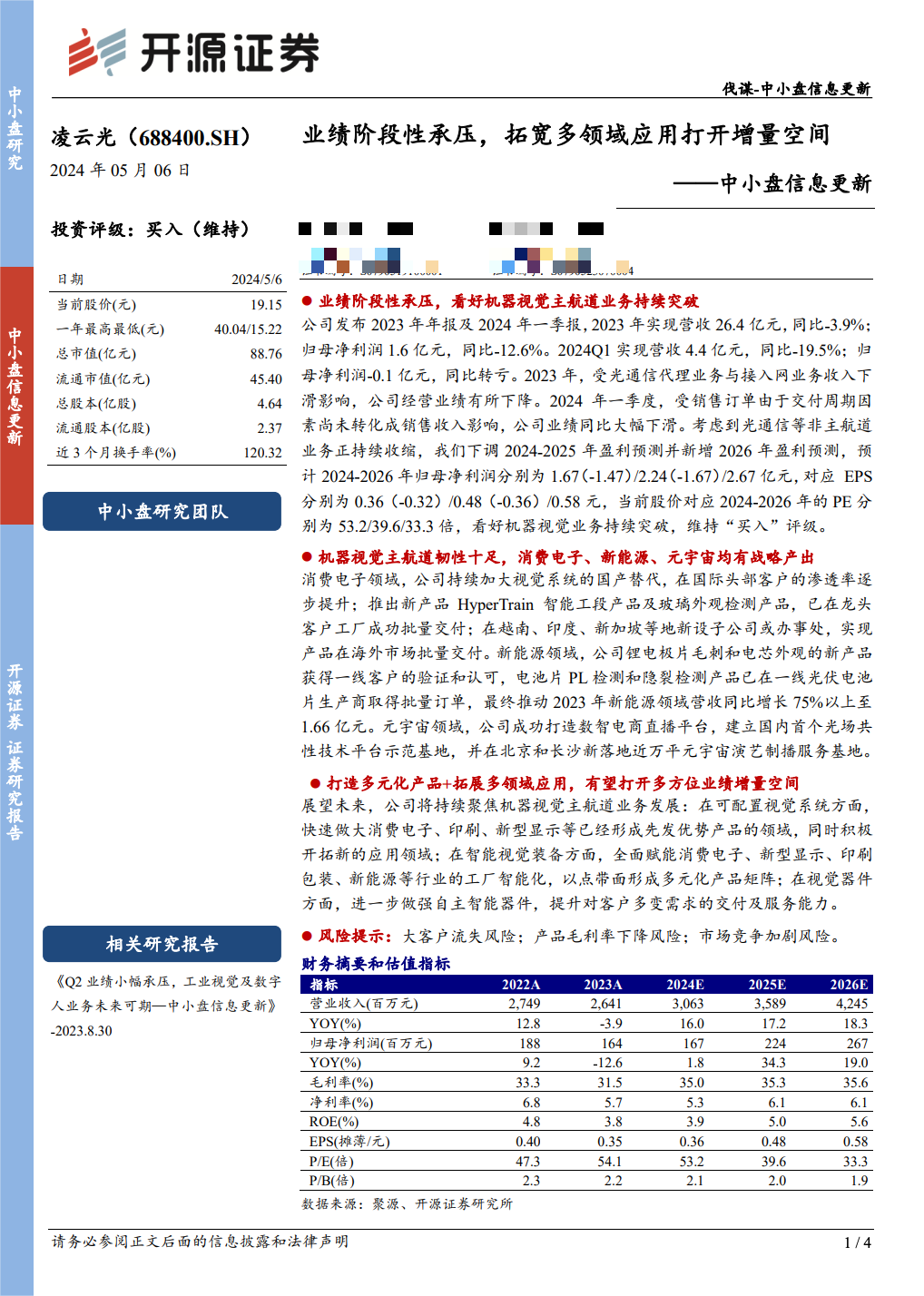 公司的机器视觉产品覆盖核心器件、可配置视觉系统、智能装备等产品线,并实现了较好的 AI 渗透,服务消费电子、新能源、汽车等工业智能制造需求。公司积极把握客户未来工艺升级方向及核心痛点,针对性推出智能化产品和解决方案,未来业绩有望稳健增长。